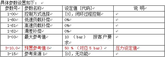通过以上设置,当恒压系统中泵的转速低于20.1 Hz时,延时10秒,启动休眠模式,变频器停止输出;在泵处在休眠状态时,当恒压供水系统的压力反馈值低于4 bar时,延时10秒,启动变频器,这样就实现了恒压供水系统的休眠功能。